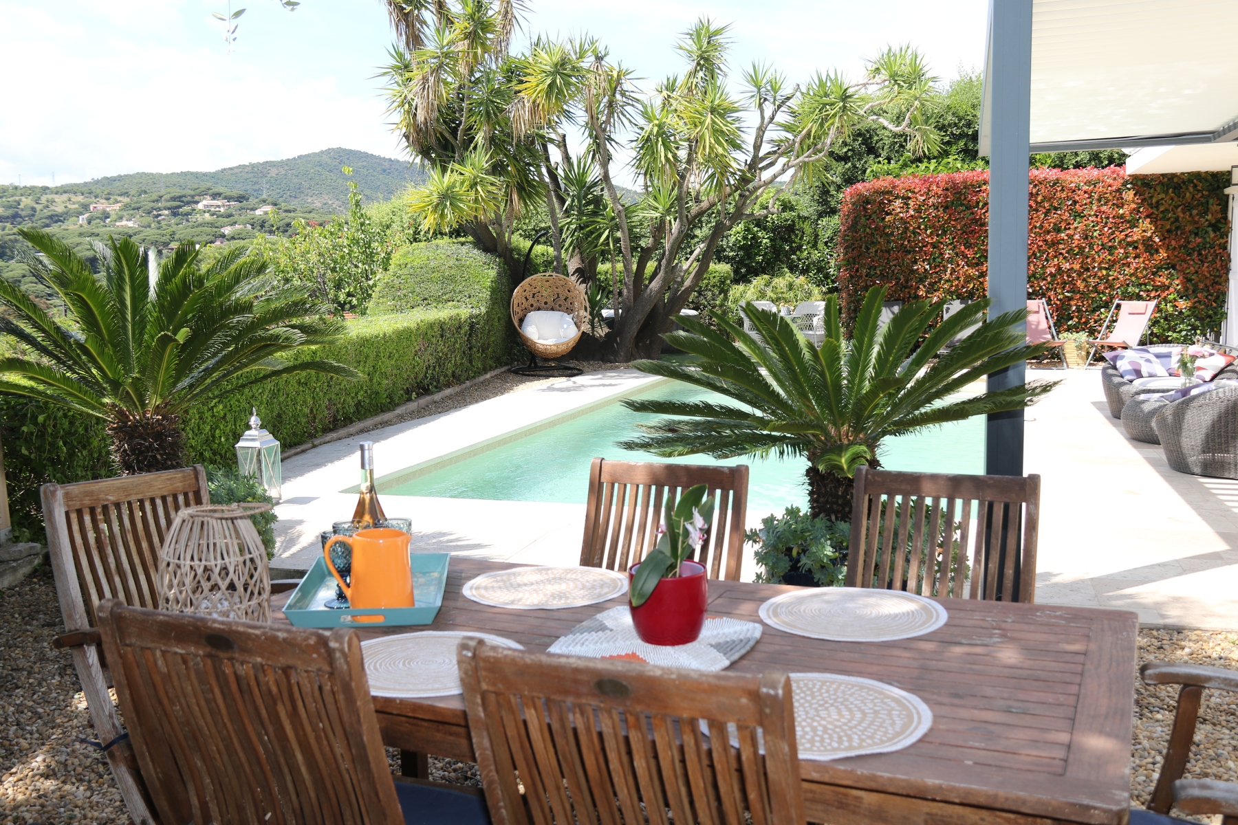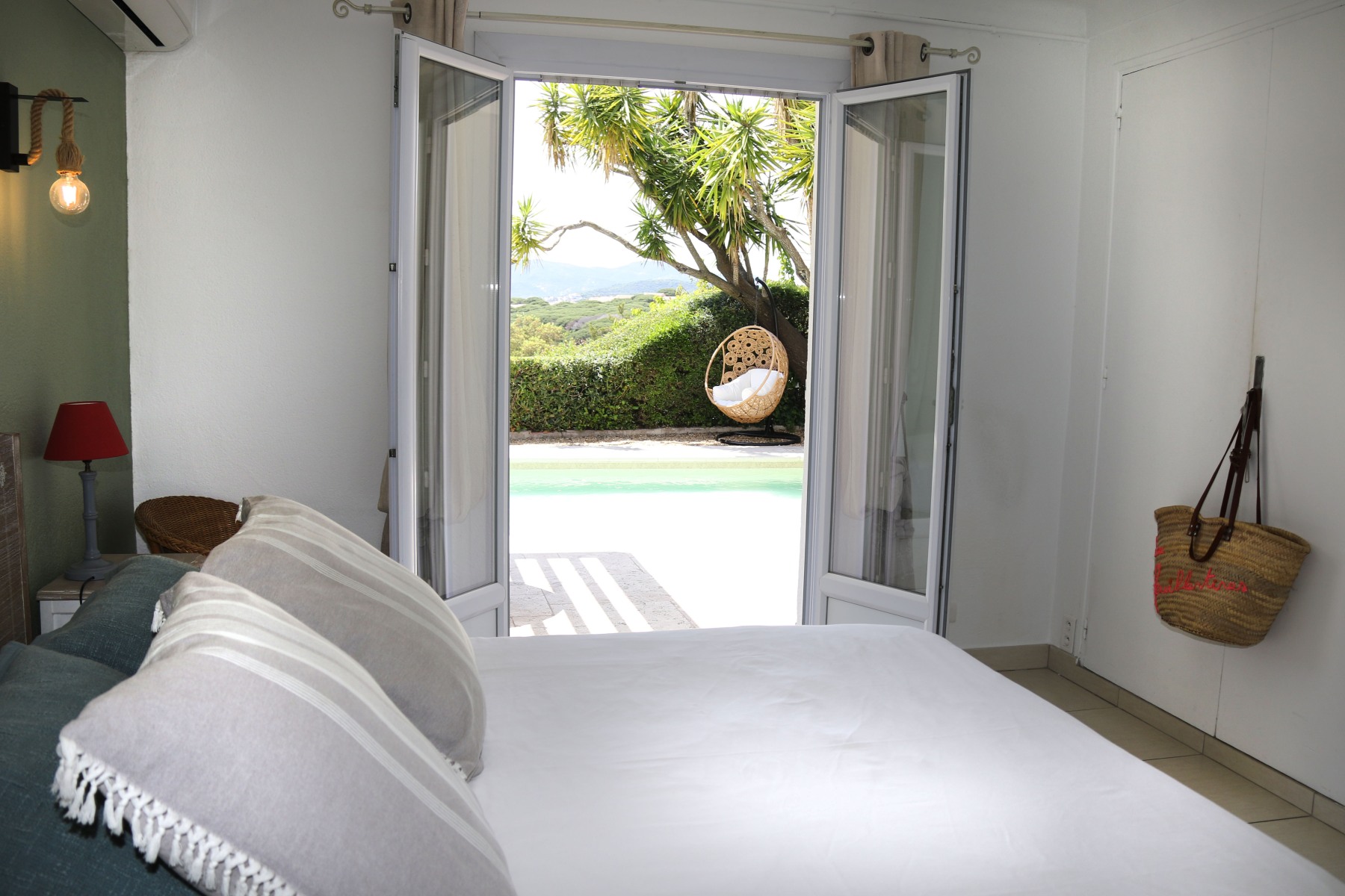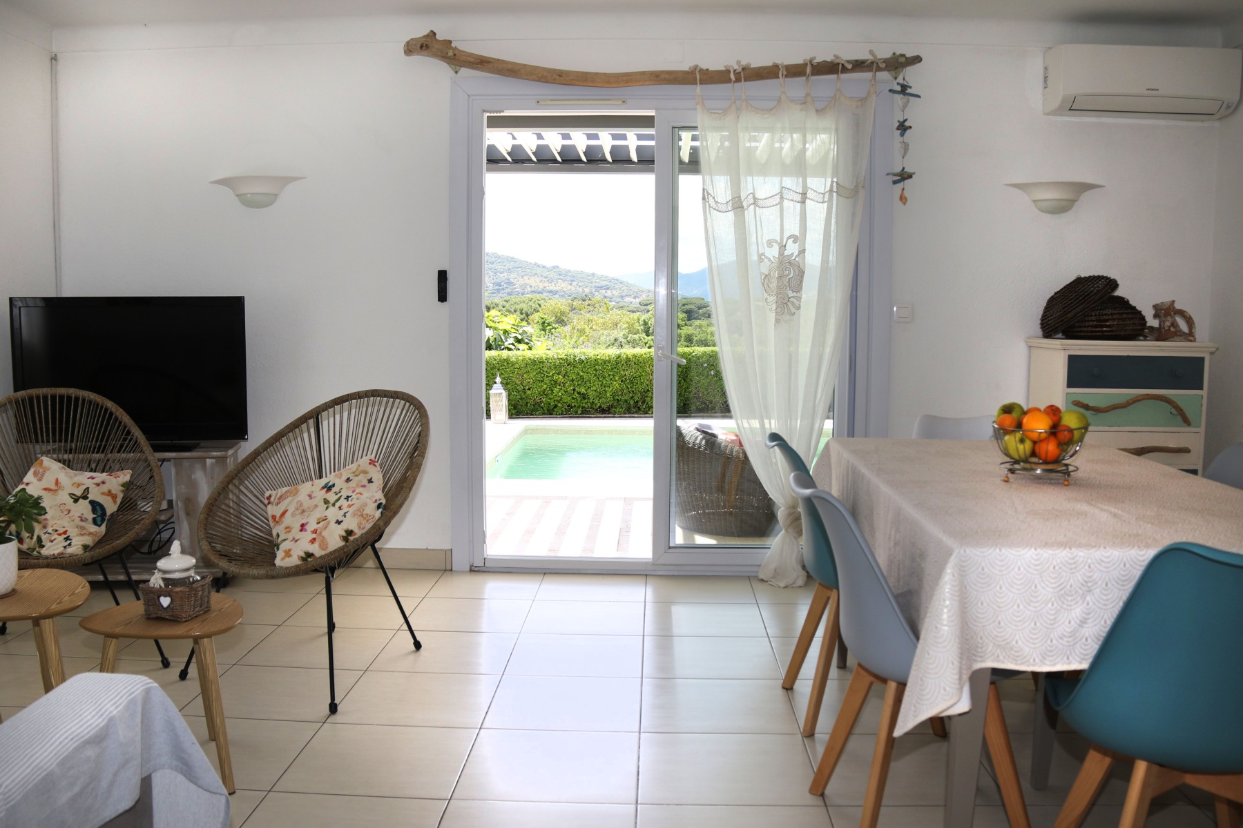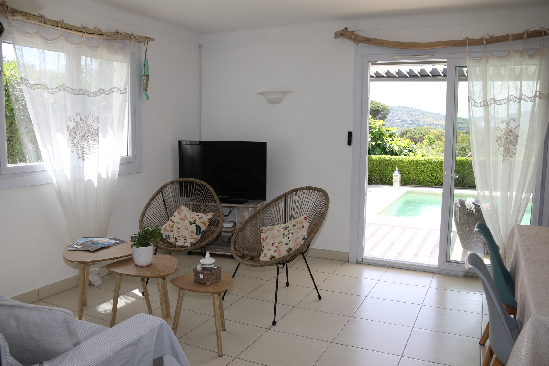 Le salon et les chambres donnent directement sur la piscine avec accès direct. Le Jardin est aménagé avec barbecue , table et chaises de jardin et parasol.