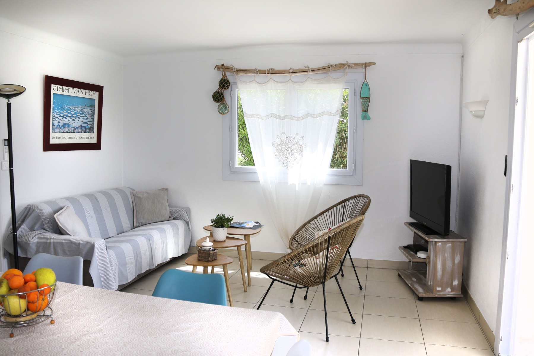 - Un salon, salle à manger avec un canapé convertible en couchage deux personnes (140×190), TV